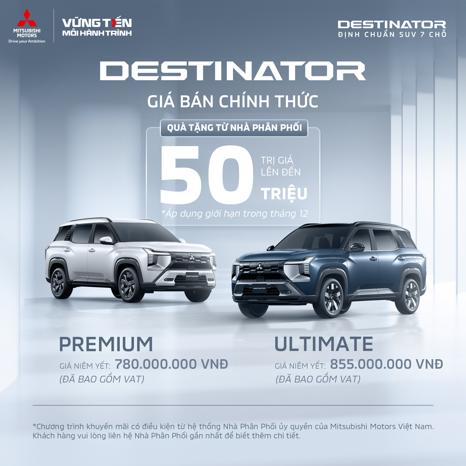 Với thông điệp "Khởi sự vạn điểm đến", Mitsubishi Destinator hội tụ 3 giá trị “Đẳng cấp – Tiện nghi – Vượt trội” của một mẫu SUV 7 chỗ đa năng cho gia đình. Mitsubishi Destinator hứa hẹn đánh thức tinh thần phiêu lưu và cùng các gia đình Việt chinh phục những cột mốc trải nghiệm đáng nhớ trên mọi cung đường.