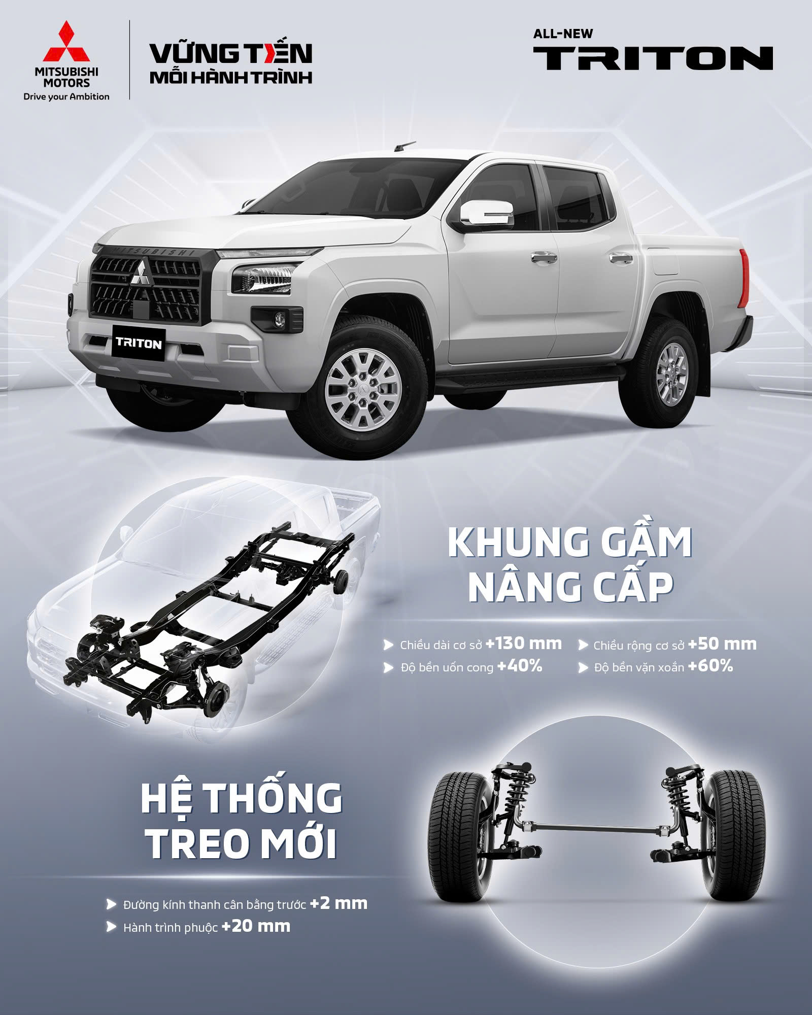 All-New Triton sở hữu khung gầm nâng cấp rộng hơn 50mm và chiều dài cơ sở thêm 130mm, sử dụng kết cấu thép siêu cường giúp cải thiện khả năng hấp thụ rung động, cách âm và tăng cường độ ổn định khi vận hành. Cùng với đó là hệ thống treo mới mang lại cảm giác lái thoải mái trên mỗi hành trình.