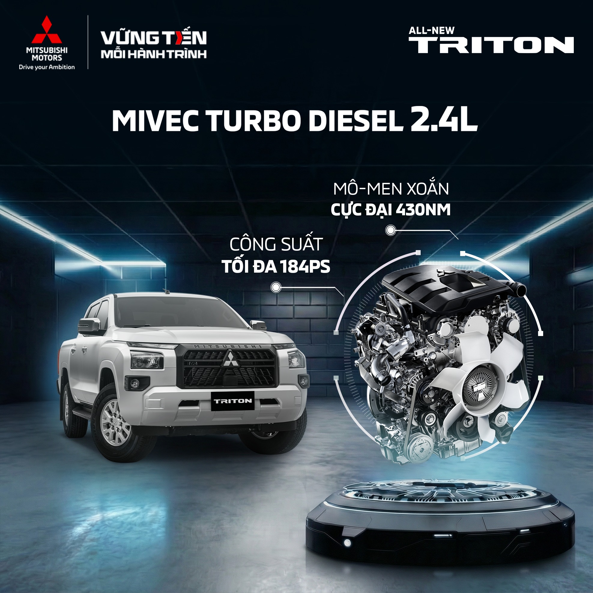 Triton GLX - chiếc bán tải mạnh mẽ và tin cậy hàng đầu phân khúc nhờ trang bị động cơ Turbo Diesel 2.4L cho công suất lên đến 184PS và 430Nm mô-men xoắn cực đại, giúp xe tăng tốc mượt mà, duy trì hiệu suất ổn định trên mọi cung đường – từ phố thị đông đúc, đường trường đến địa hình gồ ghề.